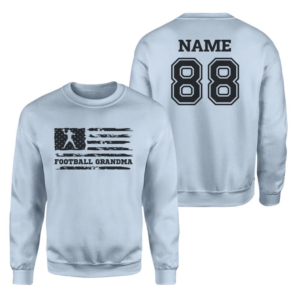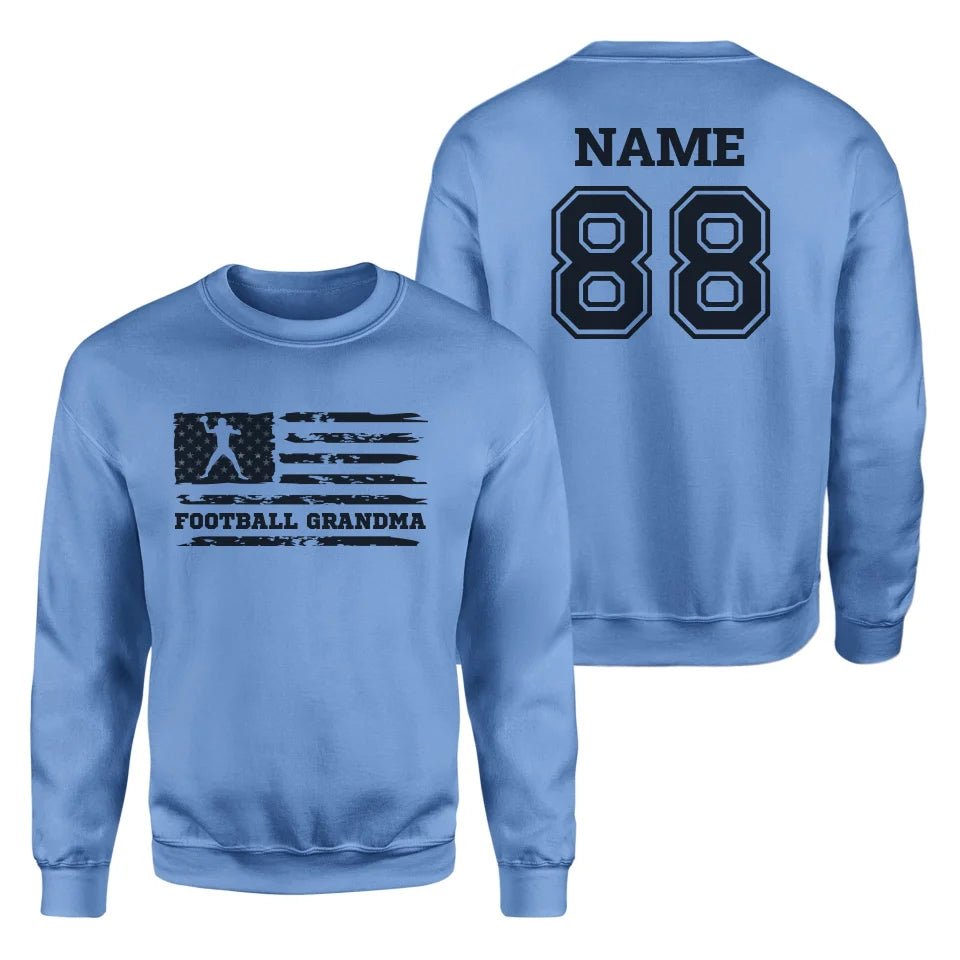 Football Grandma Sweatshirt - Cheer from the sidelines with this Distressed Flag Football Grandma Sweatshirt customized with your Football Player's name! Perfect for Mother's Day or a birthday gift, this Sweatshirt features a distressed flag design and playfully shows off your role as a ''Football Grandma''. Get ready to cheer on your child with style!