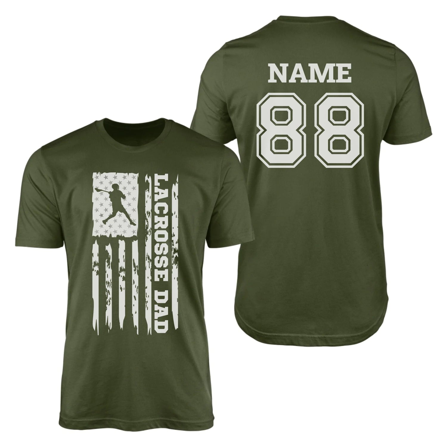 Lacrosse Dad Shirt - Cheer from the sidelines with this Distressed Flag Lacrosse Dad Men's T-Shirt customized with your Lacrosse Player's name! Perfect for Father's Day or a birthday gift, this Men's T-Shirt features a distressed flag design and playfully shows off your role as a ''Lacrosse Dad''. Get ready to cheer on your child with style!