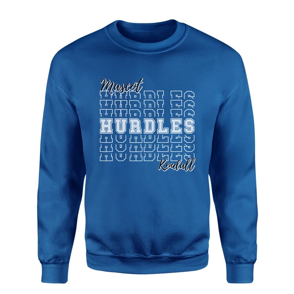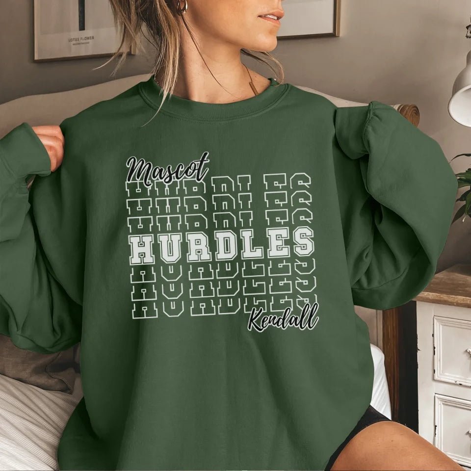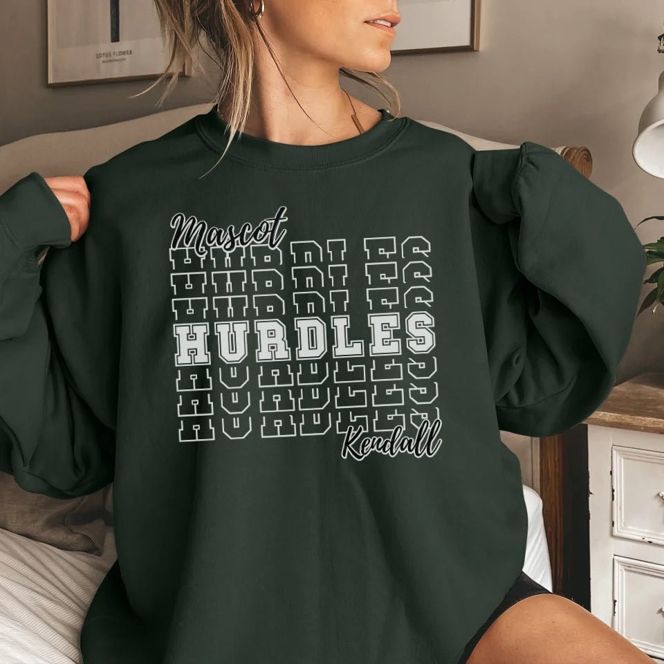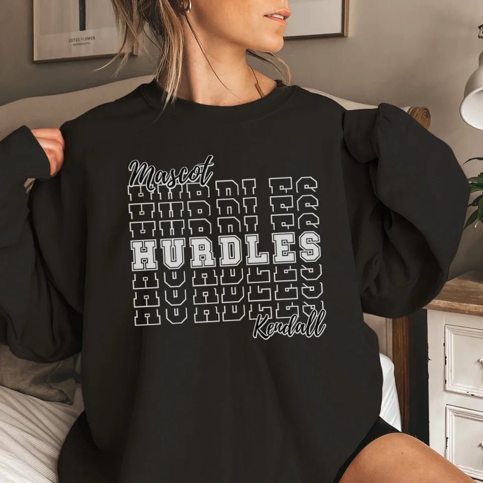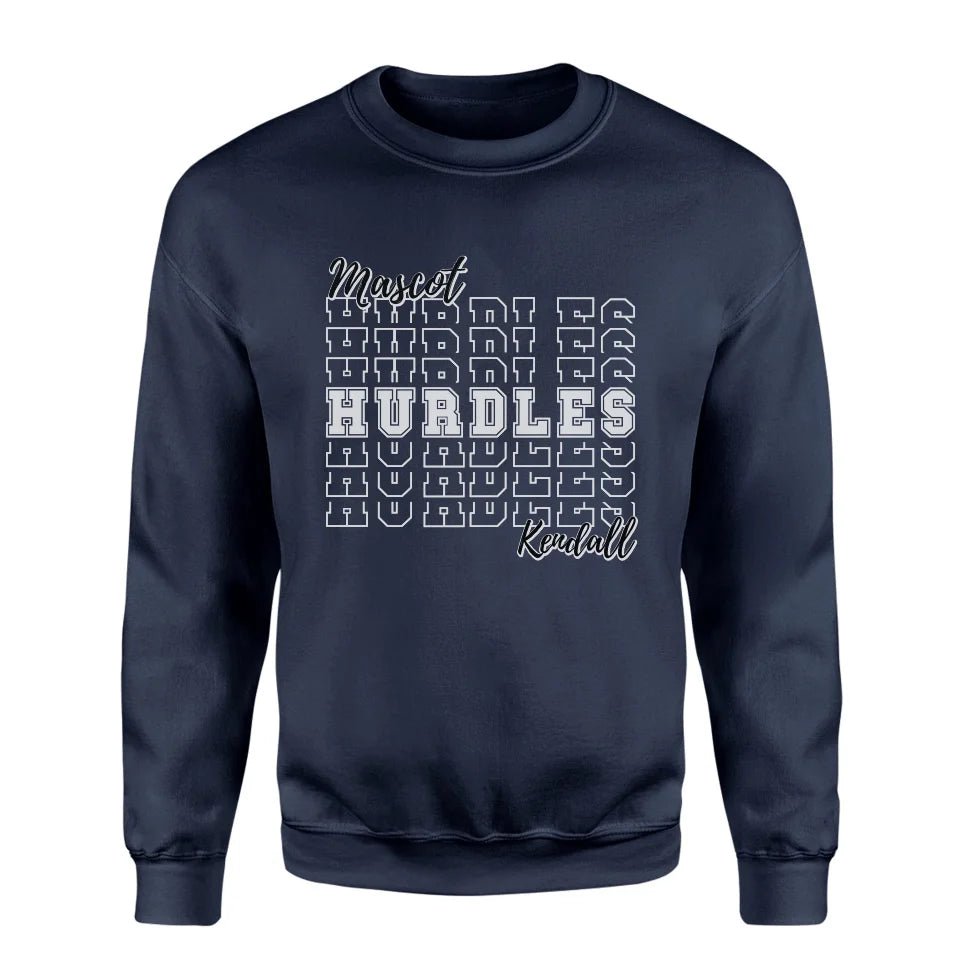 Hurdles Sweatshirt - Celebrate your young athlete with our Custom Hurdles Sweatshirt featuring your school's mascot and your hurdler's name. Perfect for showing team spirit at track meets and other athletic events, this personalized sweatshirt is a must-have for proud parents and fans. Whether you're cheering in the stands or supporting from afar, this spirit wear will help you express your pride and passion. An ideal gift choice for birthdays, holidays, or any occasion where you want to highlight your support and love for the budding hurdler in your life. Embrace the unique opportunity to wear a piece of art that resonates with your family's athletic journey and dedication.