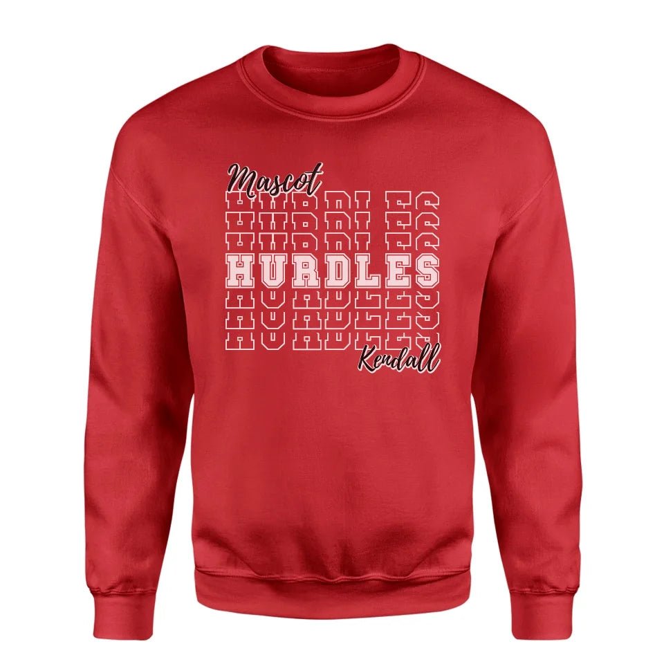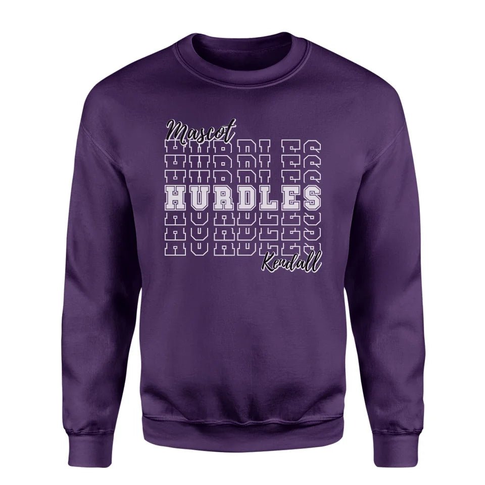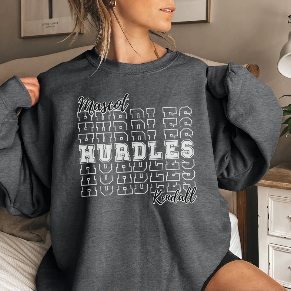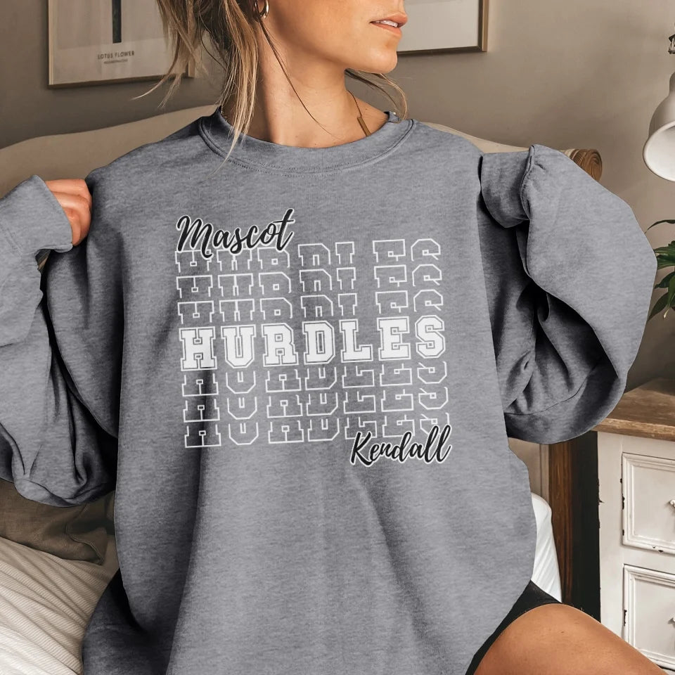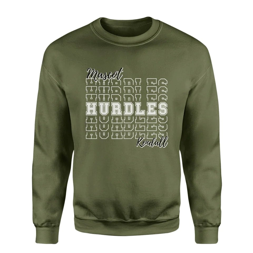 Hurdles Sweatshirt - Celebrate your young athlete with our Custom Hurdles Sweatshirt featuring your school's mascot and your hurdler's name. Perfect for showing team spirit at track meets and other athletic events, this personalized sweatshirt is a must-have for proud parents and fans. Whether you're cheering in the stands or supporting from afar, this spirit wear will help you express your pride and passion. An ideal gift choice for birthdays, holidays, or any occasion where you want to highlight your support and love for the budding hurdler in your life. Embrace the unique opportunity to wear a piece of art that resonates with your family's athletic journey and dedication.