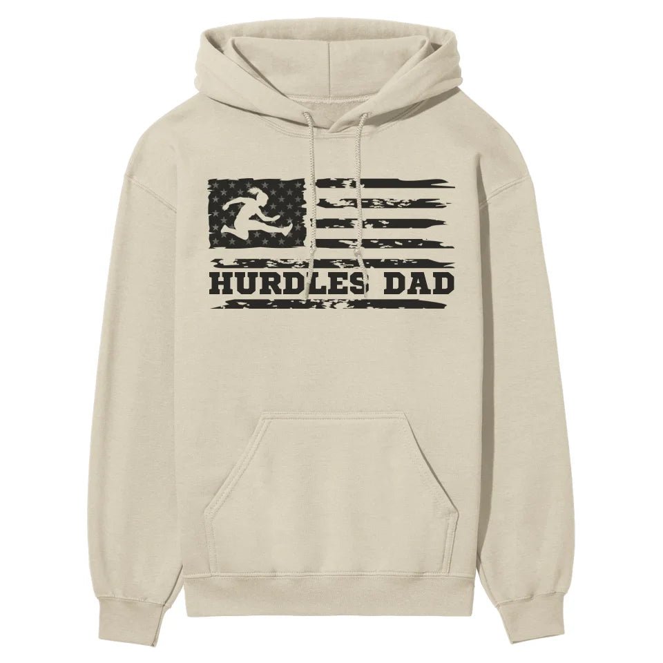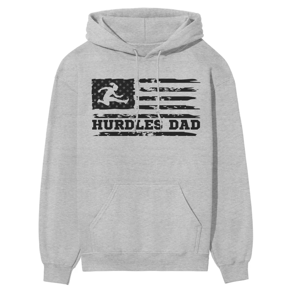 Hurdles Dad Hoodie - Celebrate your passion and showcase your team spirit with this sleek Hurdles Dad Hoodie. Perfect for proud parents of young hurdlers, this customizable spirit wear is a must-have for every track and field enthusiast. Whether you're cheering at a meet or supporting from the sidelines, this stylish black graphic hoodie makes a bold statement of support for your athlete. Ideal for gifting on Father's Day, birthdays, holidays, or any occasion, this hoodie is a heartfelt way to express your pride and encouragement. Let everyone know who you're rooting for with this eye-catching and heartfelt attire!