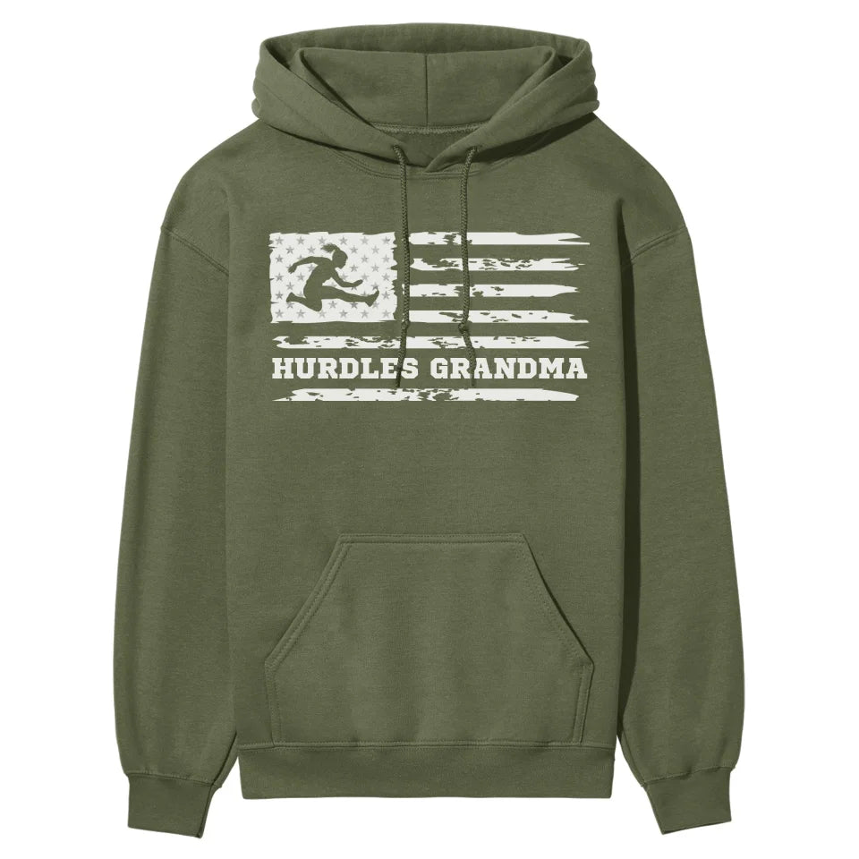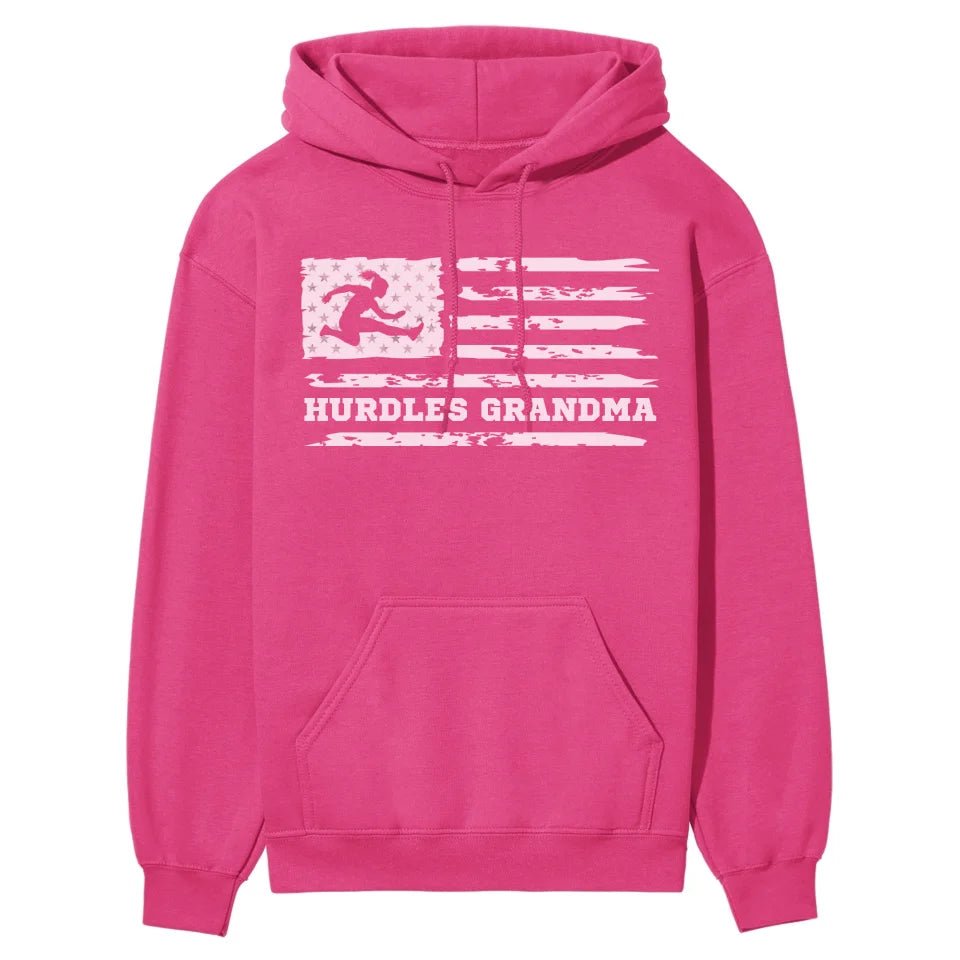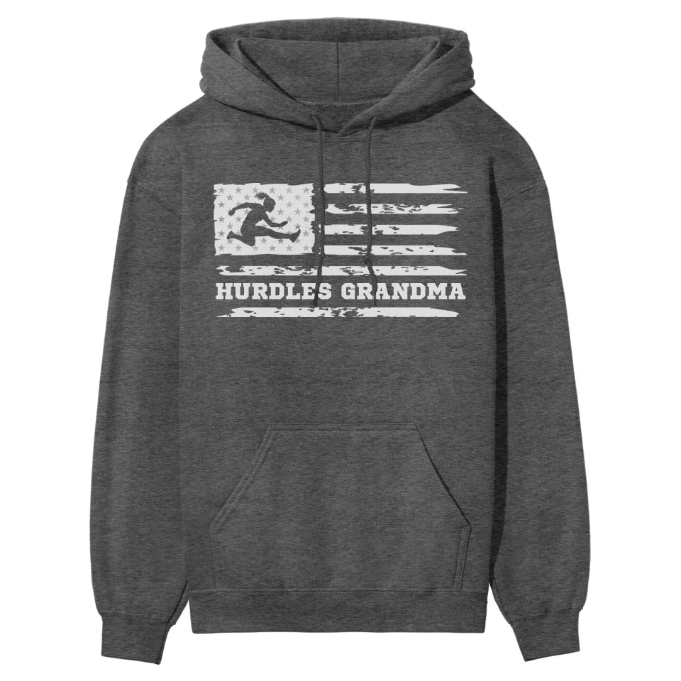 Hurdles Grandma Hoodie - Celebrate your pride and passion for your young athlete with this stylish hoodie, perfect for any track and field enthusiast. Customizable to showcase your favorite colors and team spirit, this hoodie is a must-have for grandmothers supporting their hurdles stars. It's an ideal gift for special occasions such as birthdays, holidays, or simply to cheer on their favorite athlete at every meet. Show your unwavering support and stay warm in the stands while rooting for your youth track star. This cozy hoodie is a fantastic way for proud grandmas to share their enthusiasm and be part of the action. Make every track event memorable with this spirited piece of apparel, and wear it with pride as you cheer on your family champion.