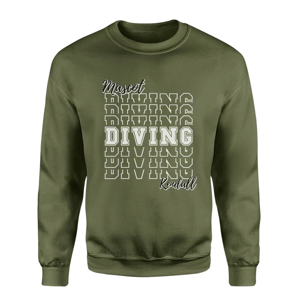 Diving Sweatshirt - Dive into team spirit with our Custom Diving Sweatshirt, personalized with your mascot and diver's name. This spirited sweatshirt is perfect for proud parents and fans who want to cheer on their youth athletes from the sidelines. Ideal for showcasing your support at diving meets or keeping warm on a chilly day. Customize it to make a unique gift for birthdays, holidays, or special occasions like Father's Day or Mother's Day. Let everyone know who you're rooting for with this standout piece of spirit wear, designed to elevate your support to the next level. Celebrate your young diver's dedication and achievements with a sweatshirt that reflects their passion and your pride.