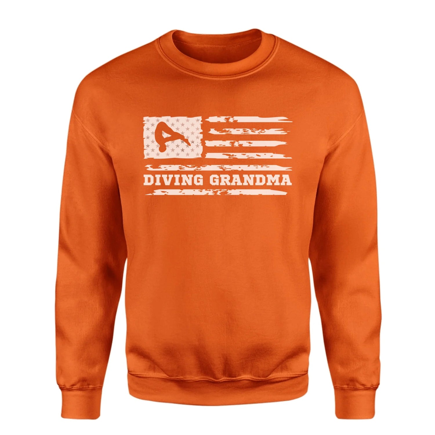 Diving Grandma Sweatshirt - Dive into style and support with this charming sweatshirt, perfect for grandmas who cheer from the sidelines. This eye-catching white graphic design can be customized to showcase your unique team pride. It's a must-have spirit wear piece for showing your support at every event, meet, or practice. Whether you're poolside or out running errands, this sweatshirt keeps the spirit alive. Ideal as a thoughtful gift for birthdays, holidays, or just because, it's a great way for grandmas to flaunt their love for their divers. Dive in and make a splash with this delightful sweatshirt.
