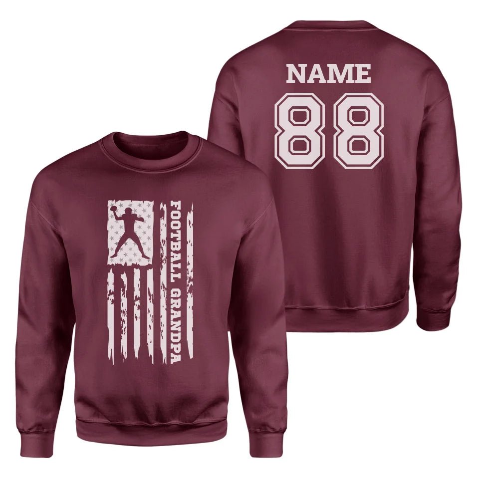Football Grandpa Sweatshirt - Cheer from the sidelines with this Distressed Flag Football Grandpa Sweatshirt customized with your Football Player's name! Perfect for Father's Day or a birthday gift, this Sweatshirt features a distressed flag design and playfully shows off your role as a ''Football Grandpa''. Get ready to cheer on your child with style!
