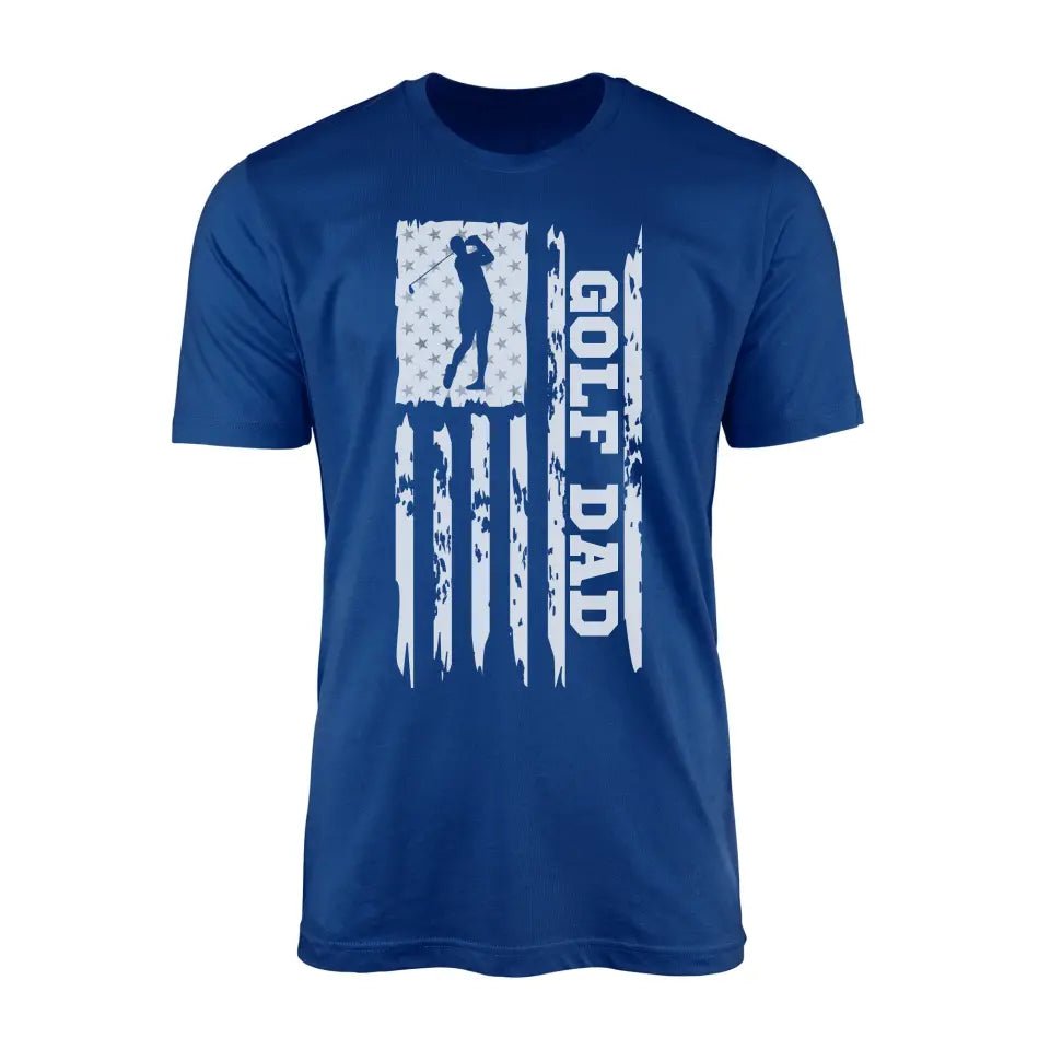 Golf Dad Shirt - Cheer from the sidelines with this Distressed Flag Golf Dad Men's T-Shirt! Perfect for Father's Day or a birthday gift, this shirt features a distressed flag design and playfully shows off your role as a ''Golf Dad''. Get ready to cheer on your child with style!