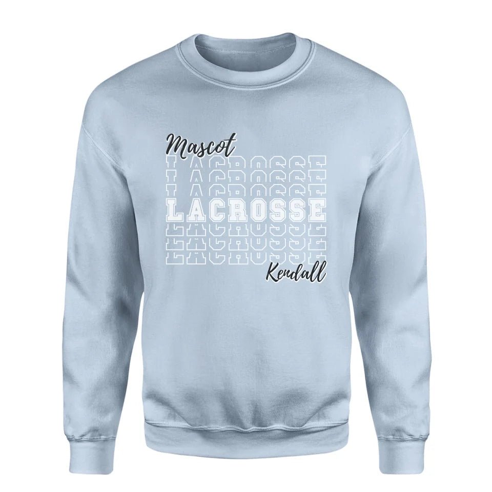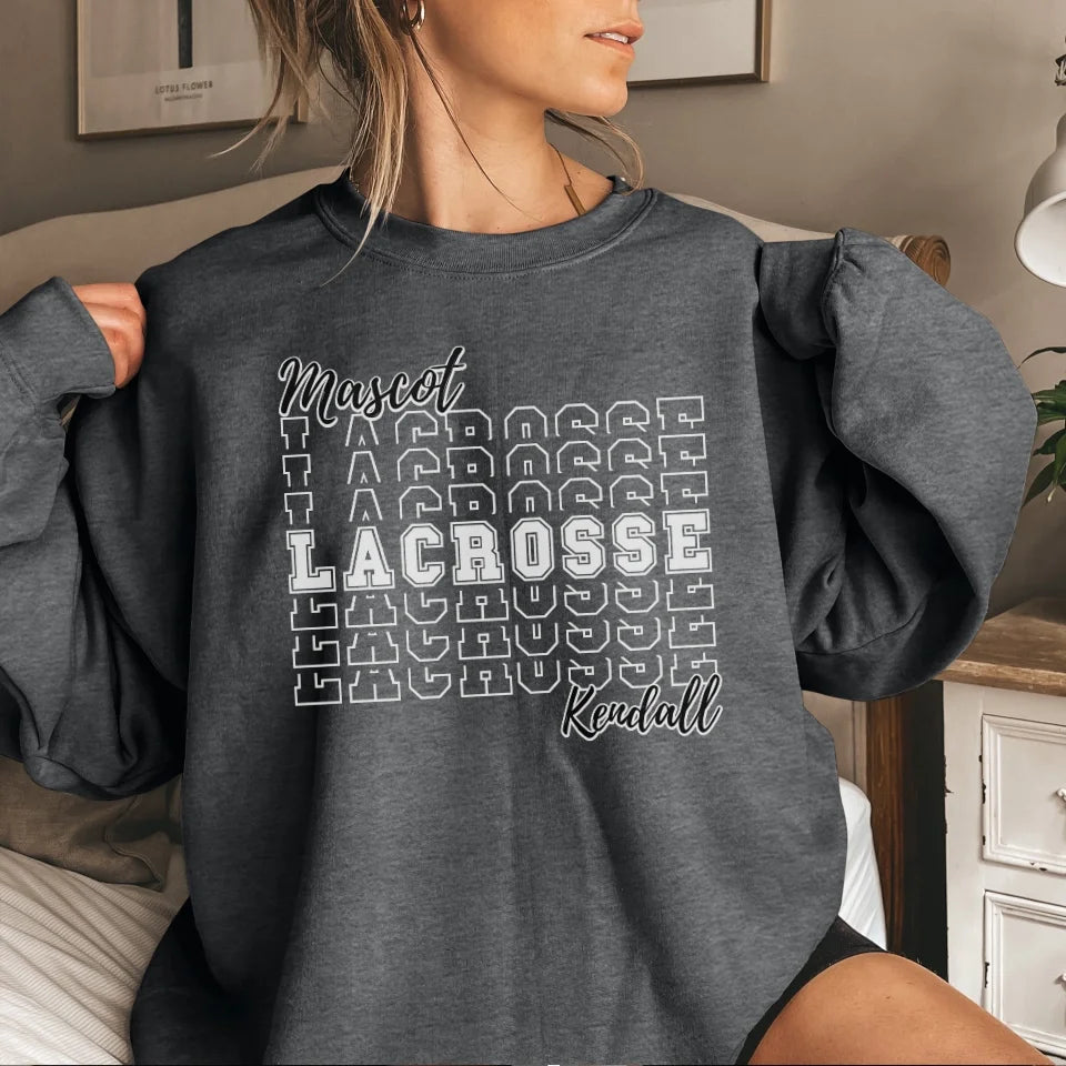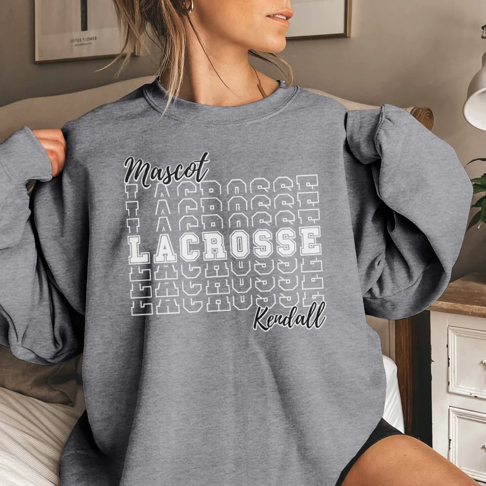 Lacrosse Sweatshirt - Celebrate your young athlete's passion with our Custom Lacrosse Sweatshirt, complete with your team's mascot and personalized with your player's name. This spirited piece of apparel is perfect for proud parents and devoted fans eager to showcase their support at every game. Whether cheering from the sidelines or running errands around town, this sweatshirt makes a bold statement about your love for the sport. It's an ideal gift for birthdays, holidays, or any special occasion that acknowledges the hard work and dedication of your lacrosse player. Perfect for Mother's Day or Father's Day, this customized sweatshirt is a heartfelt way to express your family's pride and team spirit.