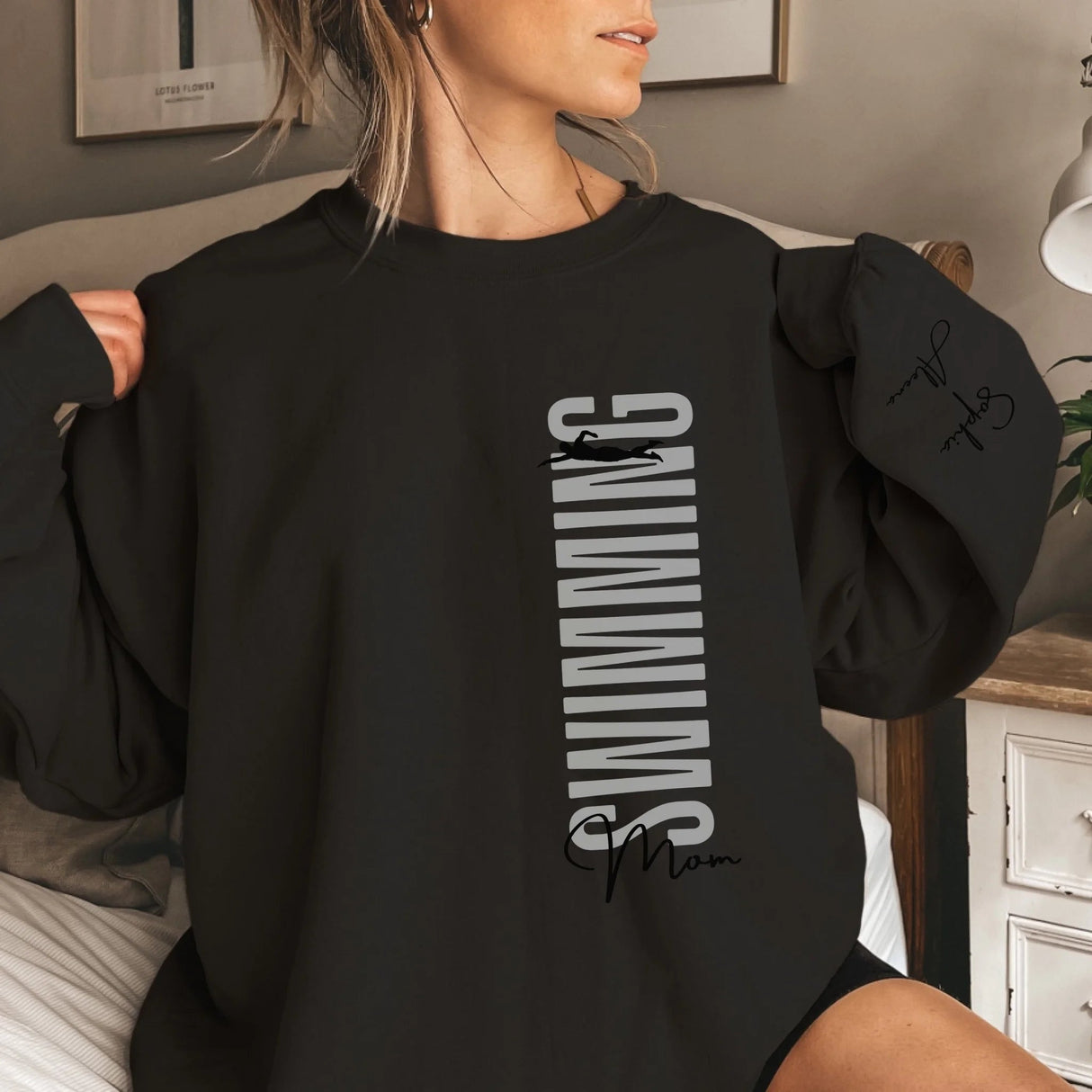 Personalized Swimming Mom Sweatshirt With Mascot, Icon, and Swimmer Name on Sleeve | Sweatshirt