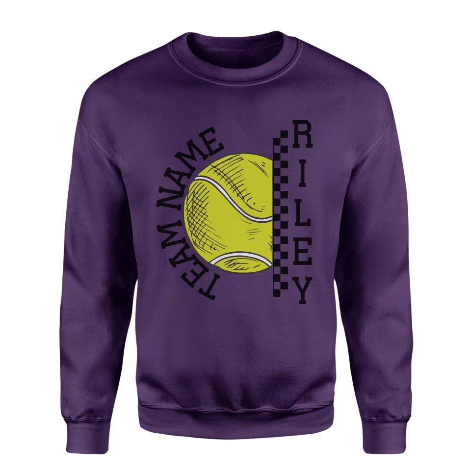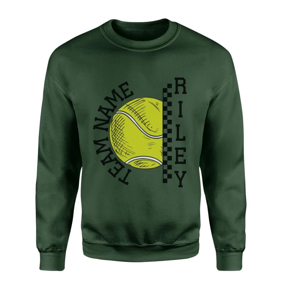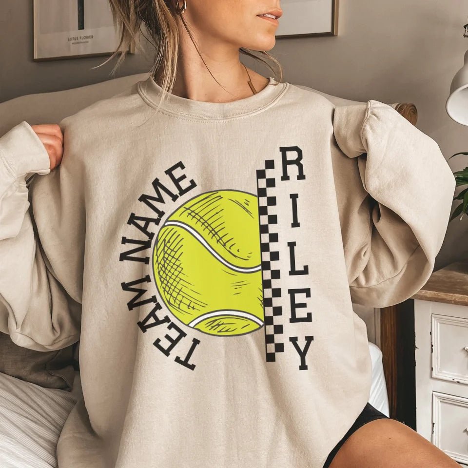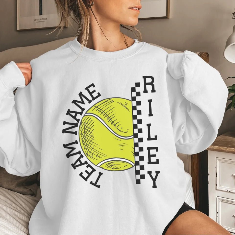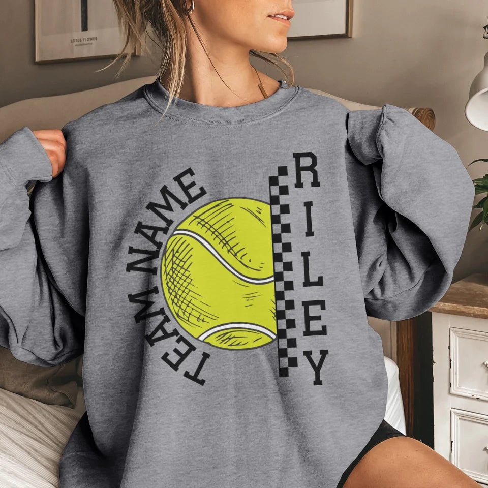 Tennis Sweatshirt - Show your team spirit with the Personalized Tennis Sweatshirt featuring both your team's name and your favorite tennis player's name. Perfect for supporters of young tennis stars, this customizable spirit wear makes a thoughtful gift for birthdays, holidays, or to simply express your pride. This sweatshirt is an ideal way for parents and fans to celebrate their athlete's passion on and off the court. Whether cheering from the sidelines or running errands, this personalized piece is a stylish nod to your commitment and enthusiasm for the game.