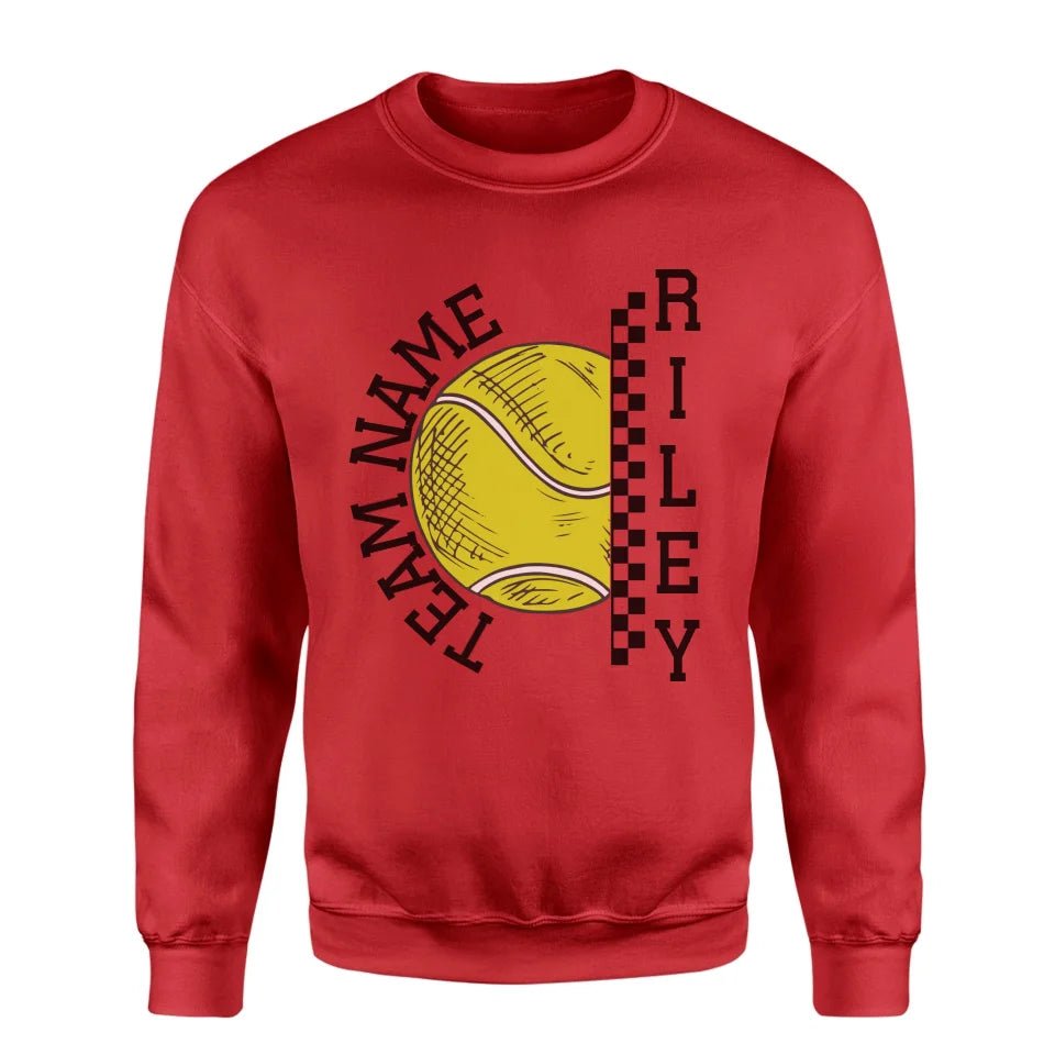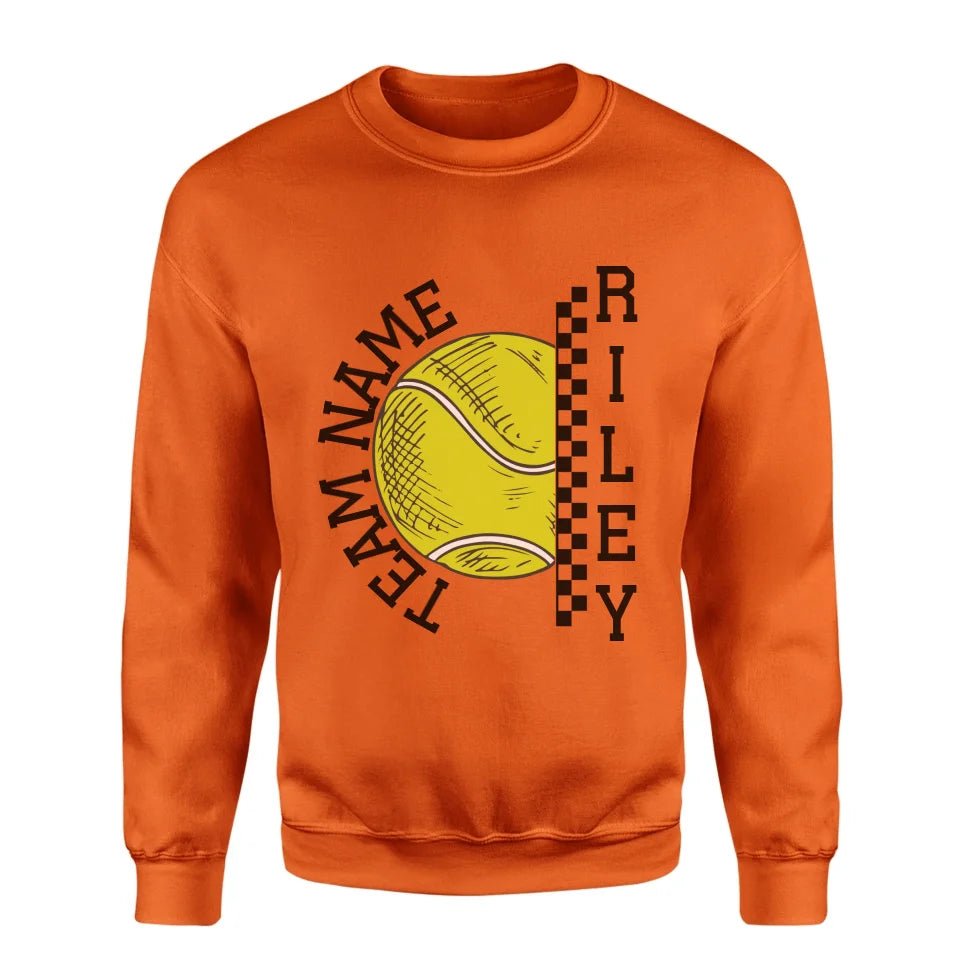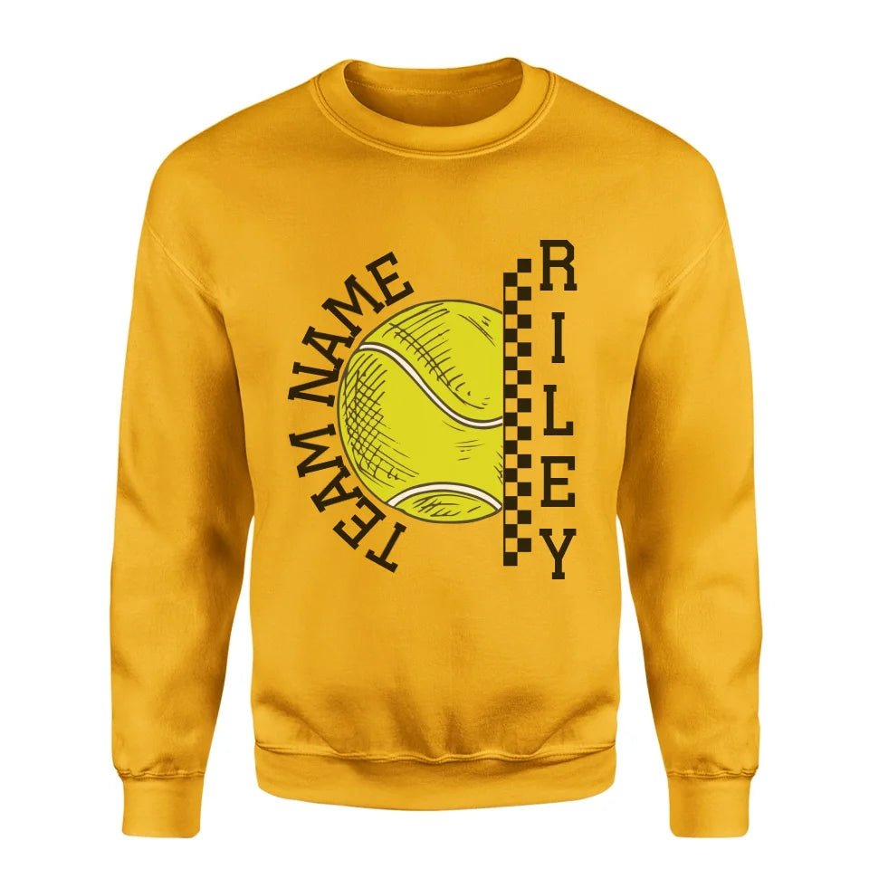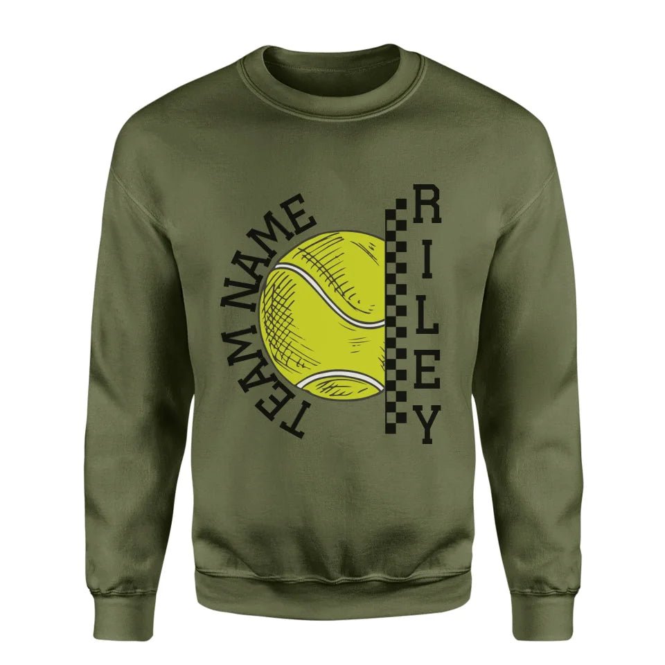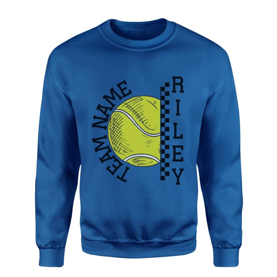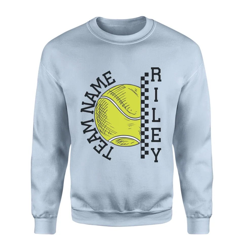 Tennis Sweatshirt - Show your team spirit with the Personalized Tennis Sweatshirt featuring both your team's name and your favorite tennis player's name. Perfect for supporters of young tennis stars, this customizable spirit wear makes a thoughtful gift for birthdays, holidays, or to simply express your pride. This sweatshirt is an ideal way for parents and fans to celebrate their athlete's passion on and off the court. Whether cheering from the sidelines or running errands, this personalized piece is a stylish nod to your commitment and enthusiasm for the game.