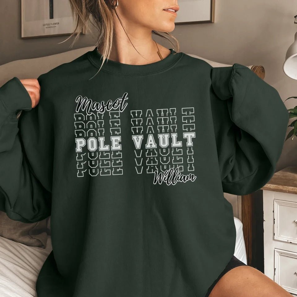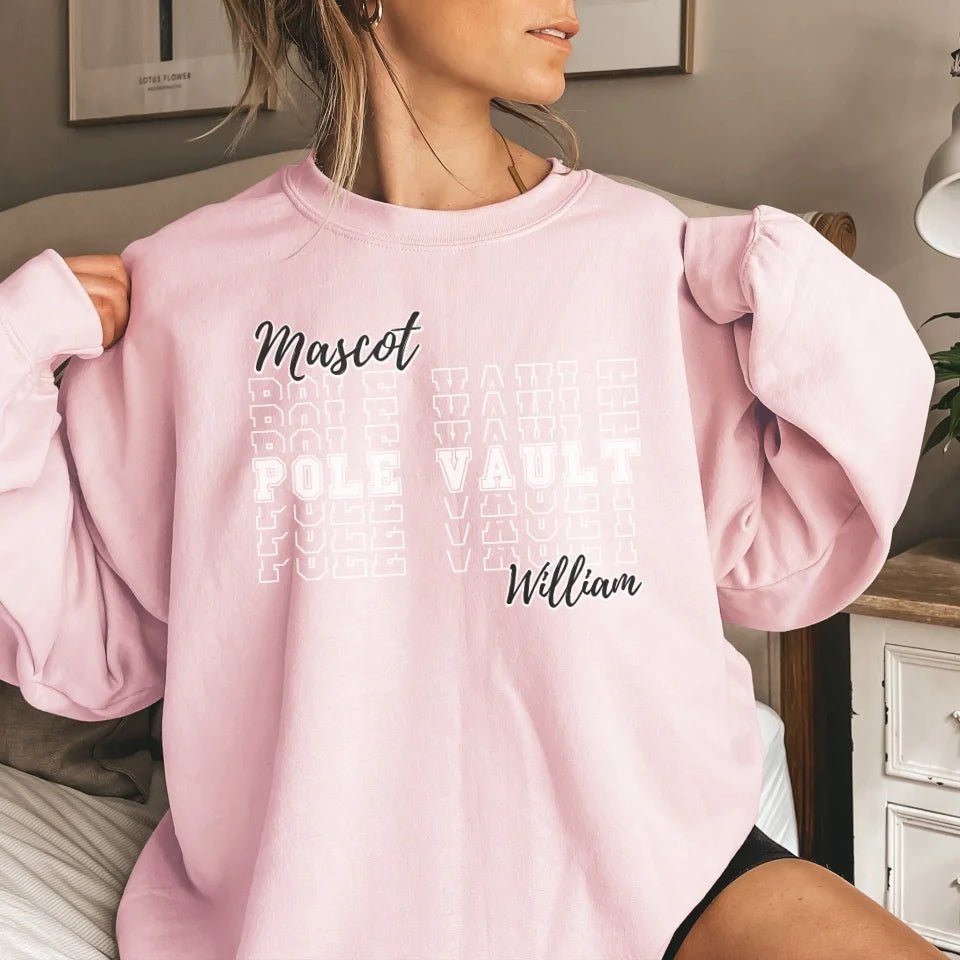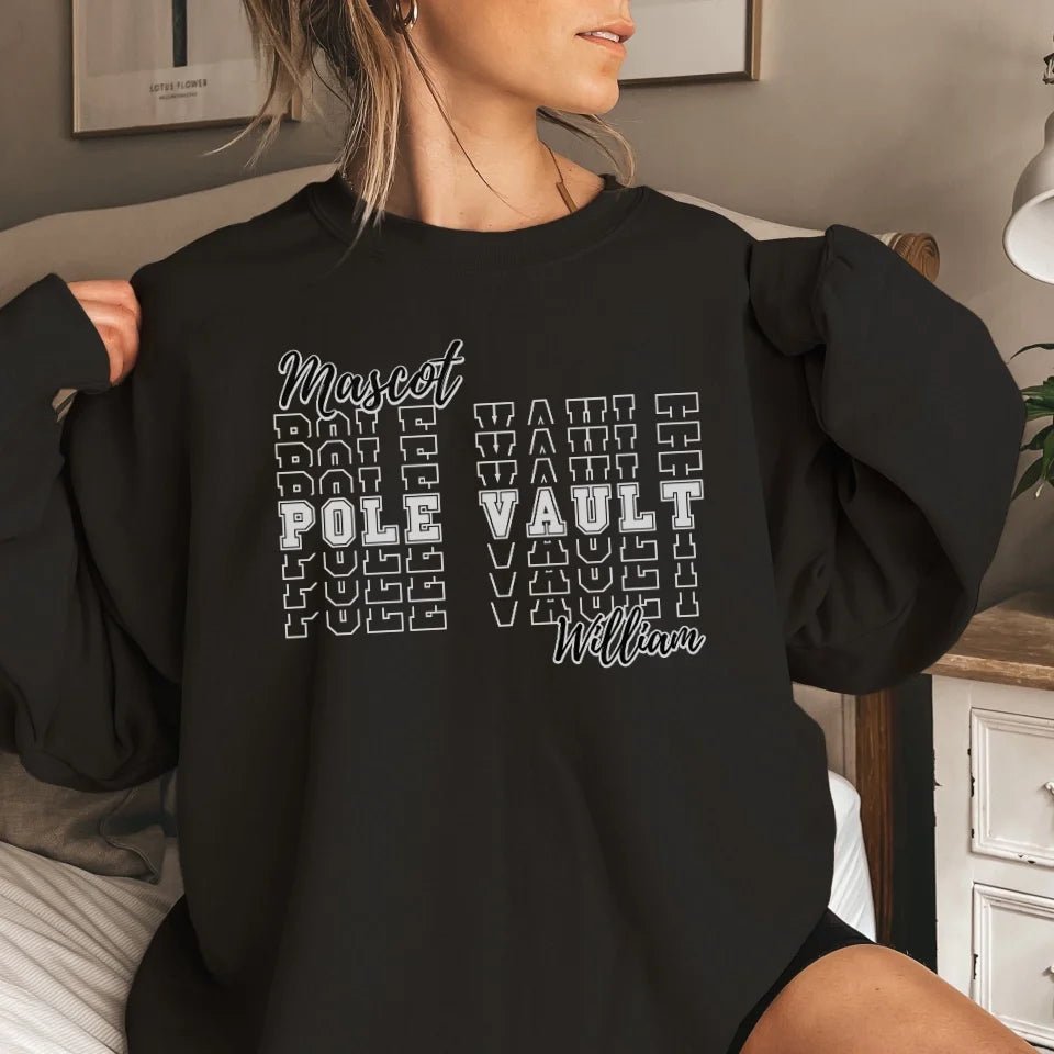 Pole Vault Sweatshirt - Showcase your pride and passion with this Custom Pole Vault Sweatshirt, featuring your team mascot and personalized pole vaulter name. Perfect for parents and fans eager to flaunt their pole vault spirit, this sweatshirt is a standout piece of spirit wear. Whether celebrating at meets or cheering from the sidelines, this sweatshirt is an ideal gift for birthdays, holidays, or any special occasion. Make it uniquely yours and display your support for youth athletes with style and enthusiasm.