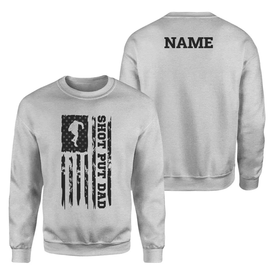 Shot put Dad Sweatshirt - Cheer from the sidelines with this Distressed Flag Shot put Dad Sweatshirt customized with your Shot putter's name! Perfect for Father's Day or a birthday gift, this Sweatshirt features a distressed flag design and playfully shows off your role as a ''Shot put Dad''. Get ready to cheer on your child with style!