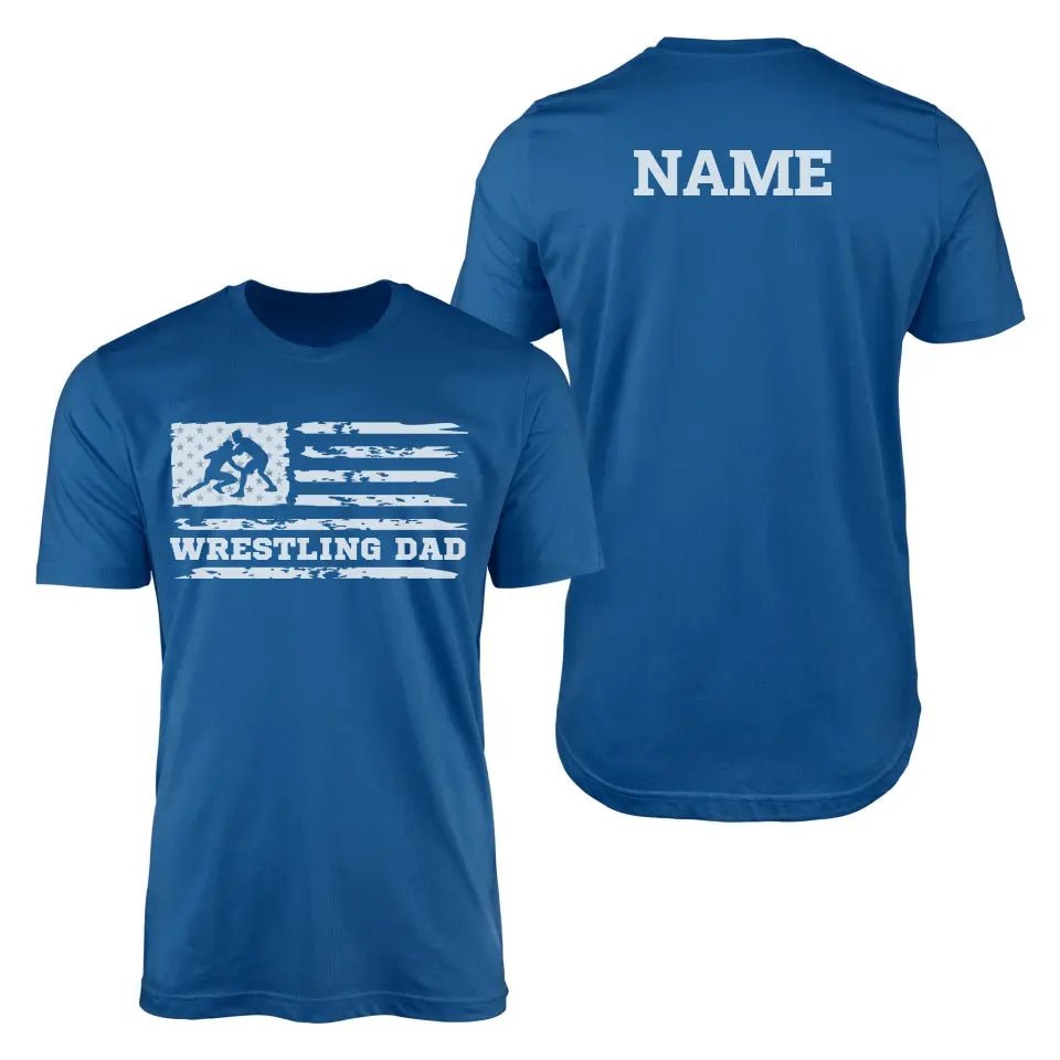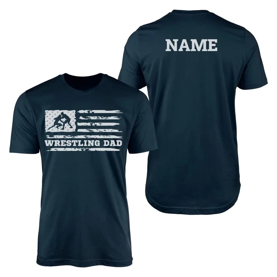 Wrestling Dad Shirt - Cheer from the sidelines with this Distressed Flag Wrestling Dad Men's T-Shirt customized with your Wrestler's name! Perfect for Father's Day or a birthday gift, this Men's T-Shirt features a distressed flag design and playfully shows off your role as a ''Wrestling Dad''. Get ready to cheer on your child with style!