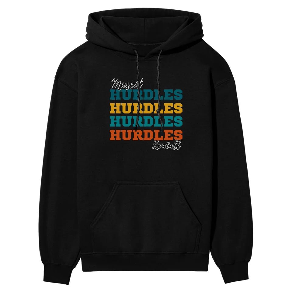 Hurdles Hoodie - Show your team spirit with the Personalized Hurdles Hoodie featuring your mascot and hurdler's name. This customizable hoodie is the perfect way for proud parents and fans of young athletes to celebrate their passion for track and field. Ideal for cheering on your hurdler at the track, this spirited piece of apparel makes a thoughtful gift for birthdays, holidays, and other special occasions. Whether you're wearing it to support your favorite athlete or gifting it for Father's Day or Mother's Day, this hoodie transforms team pride into a wearable statement. Elevate your sideline style and stand out in the crowd with a hoodie that truly represents your dedication to your young hurdler's success.